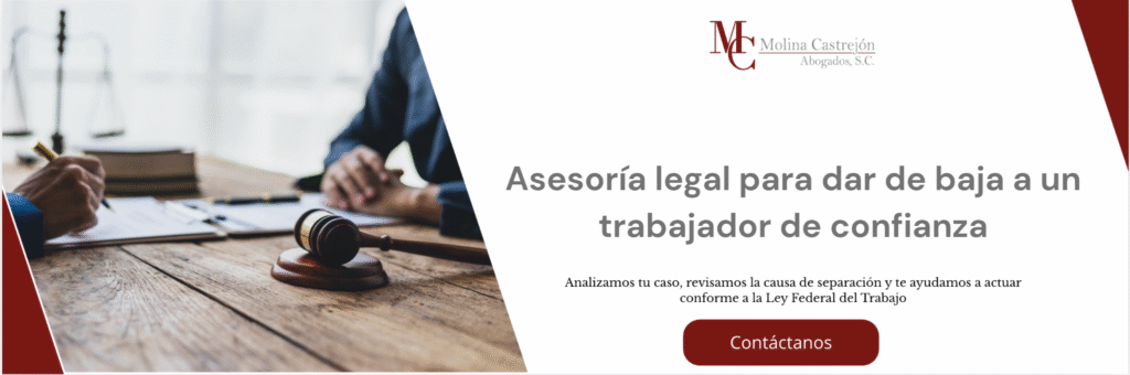 Si tu empresa necesita orientación sobre cómo dar de baja a un trabajador de confianza, lo más sensato es no improvisar. Cuando el tema se revisa con calma, fundamento legal y un trato respetuoso, es mucho más fácil proteger el negocio sin perder de vista que del otro lado hay una persona.Y si buscas apoyo para hacerlo de forma correcta, clara y estratégica, vale la pena acercarse a Abogados Molina Castrejón.